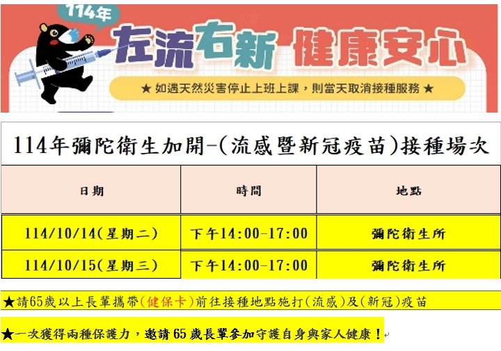資料更新時間:114-10-10 12:26 發布單位:彌陀區衛生所